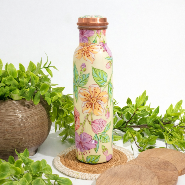 Die Kupferwasserflasche mit Blumendruck 950 ml ist ideal für Menschen, die Ayurveda, Stil und bewusste Trinkrituale verbinden möchten.