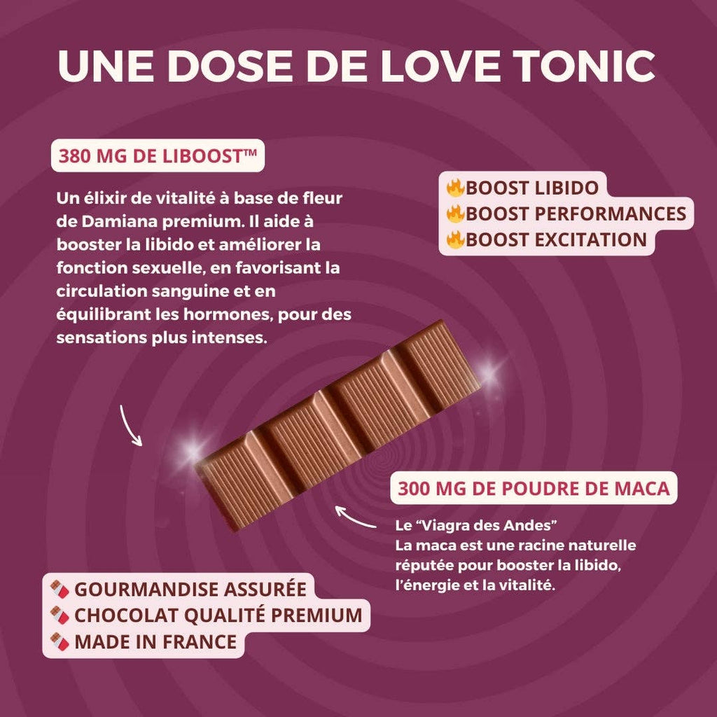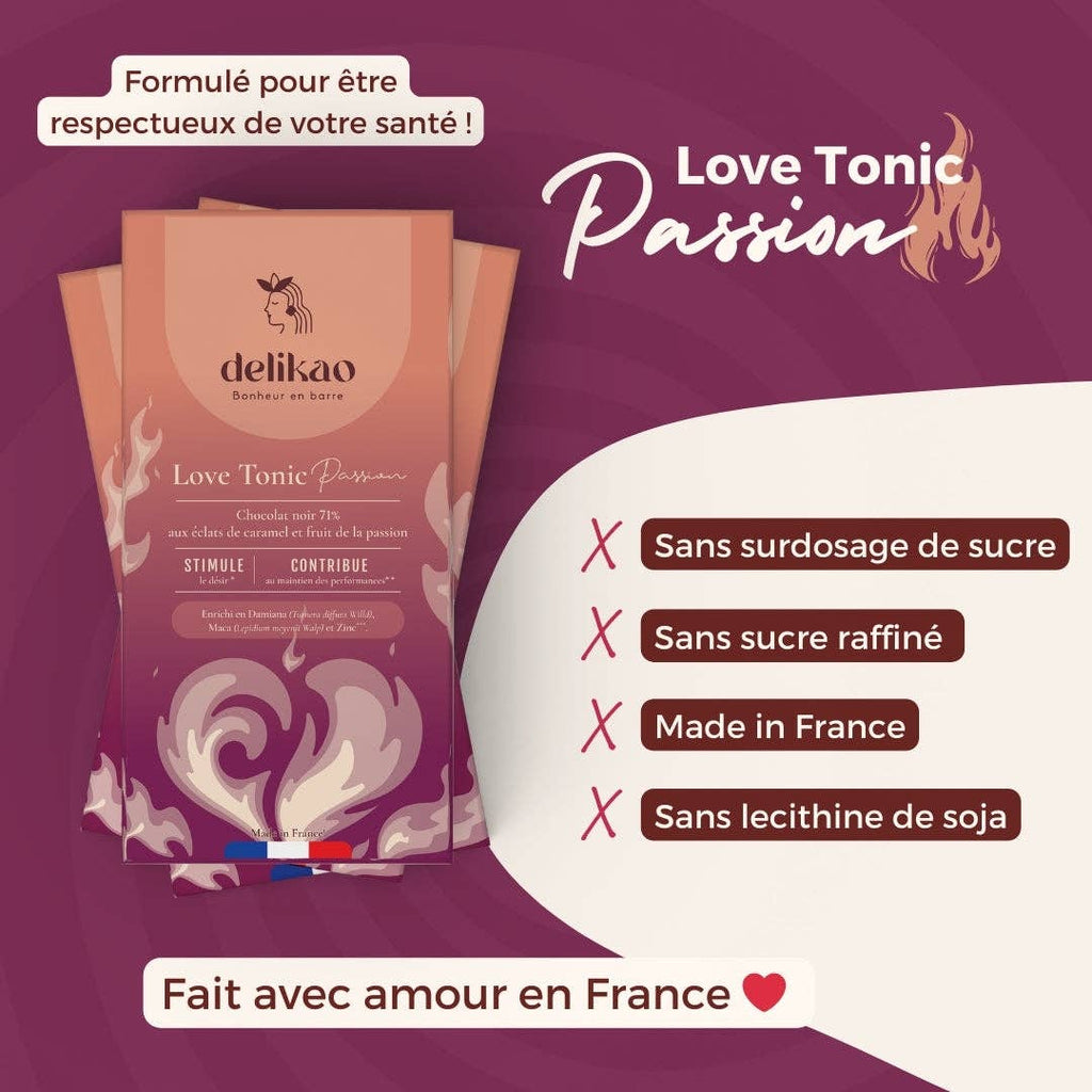 Discover Delikao Love Tonic Passion , the luxurious 71% dark chocolate that combines indulgence with a sensually activating effect. This innovative chocolate creation is more than just a treat for the palate – it was specifically developed to ignite your passion , increase emotional desire , and awaken your sensuality .