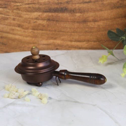 Diese elegante Räucherschale mit Griff in Kupferoptik von Green Tree ist ein praktischer und dekorativer Räucherbrenner für Räucherkörner, Harze, Bakhoor und loses Räucherwerk. Die Kombination aus pulverbeschichtetem Metall und einem kunstvoll geschnitzten Mangoholzgriff vereint Funktionalität mit traditioneller Handwerksästhetik.