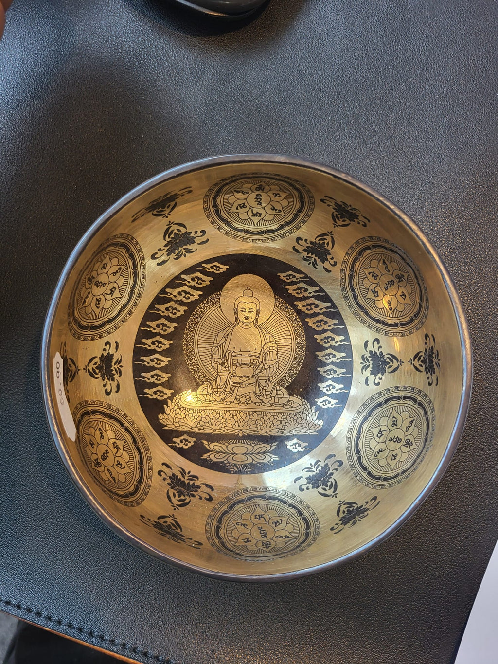 Am inneren Rand der Schale sind mehrfach Lotus-Mandala-Motive mit eingeprägten Mantra-Zeichen zu sehen. Diese wiederkehrenden Symbole stehen traditionell für Reinheit, Bewusstsein und den Weg der inneren Entfaltung. Die Gravuren sind in einer kontrastreichen Gold-Schwarz-Technik ausgeführt, was der Schale eine klare, kraftvolle Ausstrahlung verleiht.